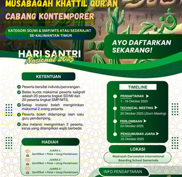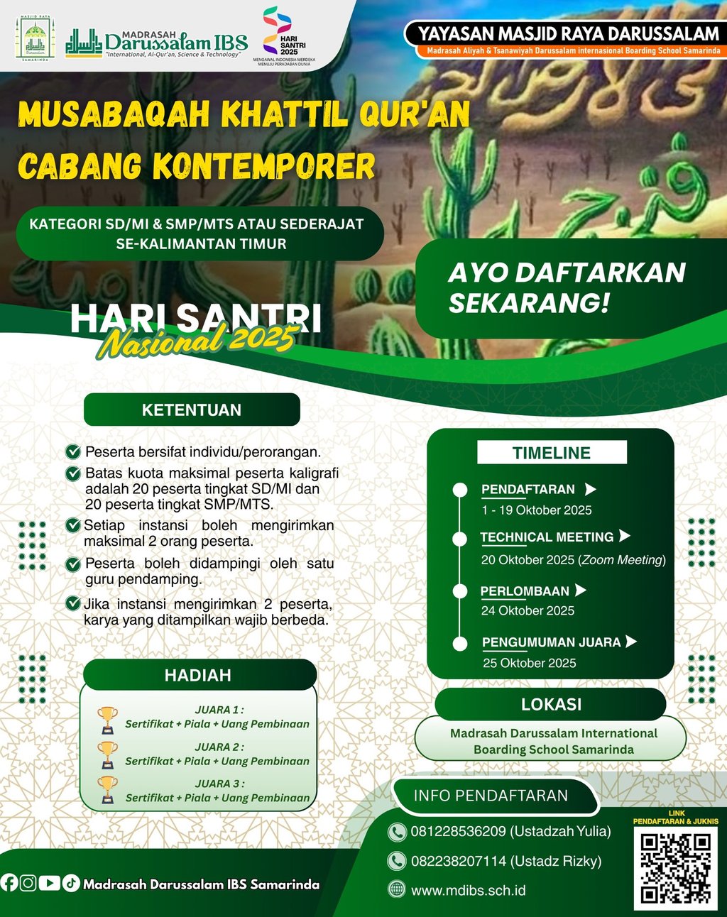 Madrasah Darussalam IBS Samarinda tengah menyiapkan peringatan Hari Santri Nasional 2025 dengan kegiatan edukatif, sosial, dan religius, termasuk Pasar Murah dan Lomba Kaligrafi tingkat MI/SD dan MTs/SMP.