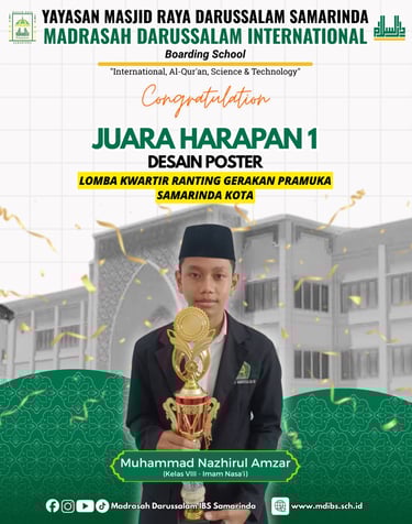 Mdibs.sch.id - Satu lagi prestasi membanggakan diraih oleh santri Madrasah Darussalam International Boarding School. Muhammad Nazhirul Amzar, santri kelas VIII Imam Nasa’i MTs Darussalam IBS, berhasil meraih Juara Harapan 1 dalam Lomba Desain Poster pada ajang Perlombaan Kwartir Ranting Gerakan Pramuka Samarinda Kota 2025.