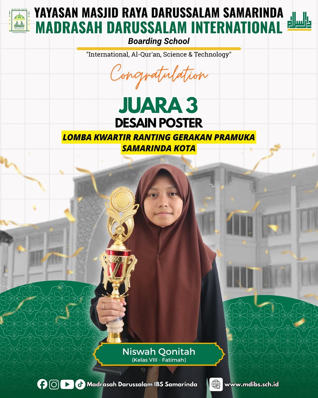 Niswah Qonita, santri kelas VIII Fatimah MTs Darussalam International Boarding School, meraih Juara 3 dalam Lomba Desain Poster Kwartir Ranting Gerakan Pramuka Samarinda Kota 2025.