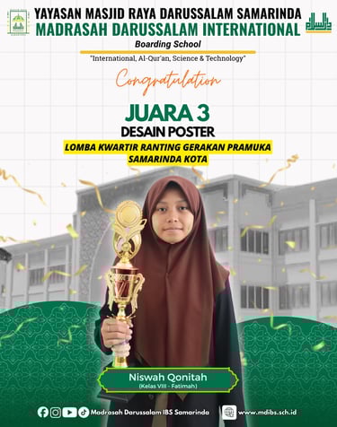 Mdibs.sch.id - Samarinda, 26 Oktober 2025 prestasi membanggakan kembali diraih oleh santri Madrasah Darussalam International Boarding School. Kali ini datang dari bidang seni digital. Niswah Qonita, santri kelas VIII Fatimah MTs Darussalam International Boarding School, berhasil meraih Juara 3 dalam Lomba Desain Poster pada ajang Perlombaan Kwartir Ranting Gerakan Pramuka Samarinda Kota 2025.