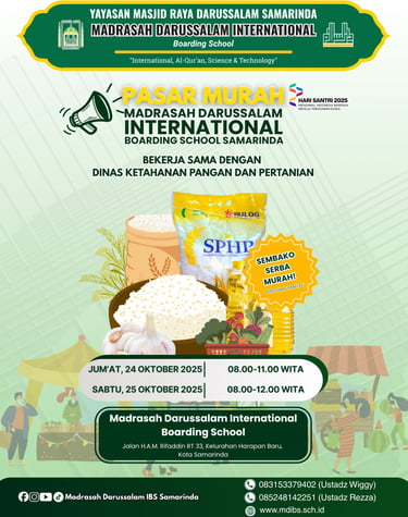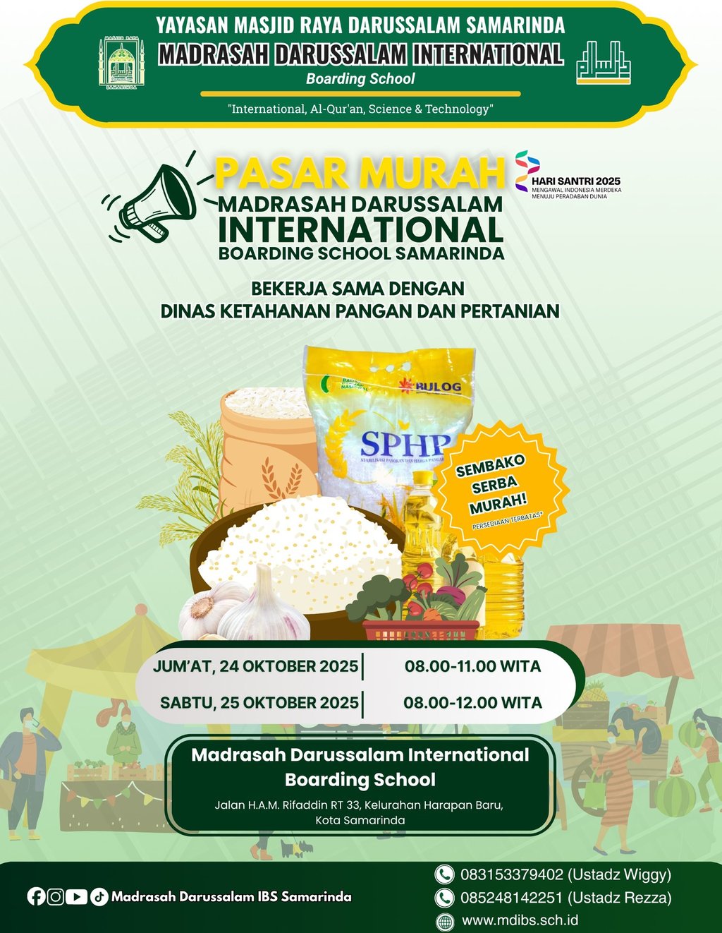 Madrasah Darussalam International Boarding School bekerja sama dengan Dinas Ketahanan Pangan dan Pertanian Kota Samarinda mengadakan Pasar Murah Darussalam 2025 pada 24–25 Oktober 2025. Warga dapat membeli berbagai sembako murah dengan harga terjangkau dan suasana penuh keberkahan.