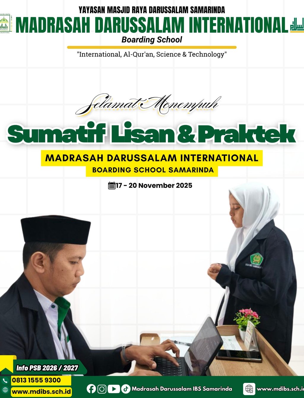 Mdibs.sch.id - Madrasah Darussalam International Boarding School resmi memulai pelaksanaan Sumatif Lisan dan Praktik yang berlangsung selama empat hari, mulai Senin, 17 November hingga Kamis, 20 November 2025. Kegiatan ini diikuti oleh seluruh santri dari berbagai jenjang dan dilaksanakan di lingkungan madrasah dengan pengawasan langsung para ustadz dan ustadzah.