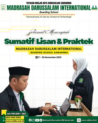 Madrasah Darussalam International Boarding School melaksanakan Sumatif Lisan dan Praktik pada 17–20 November 2025. Para santri mengikuti ujian dengan penuh percaya diri, didampingi ustadz-ustadzah.