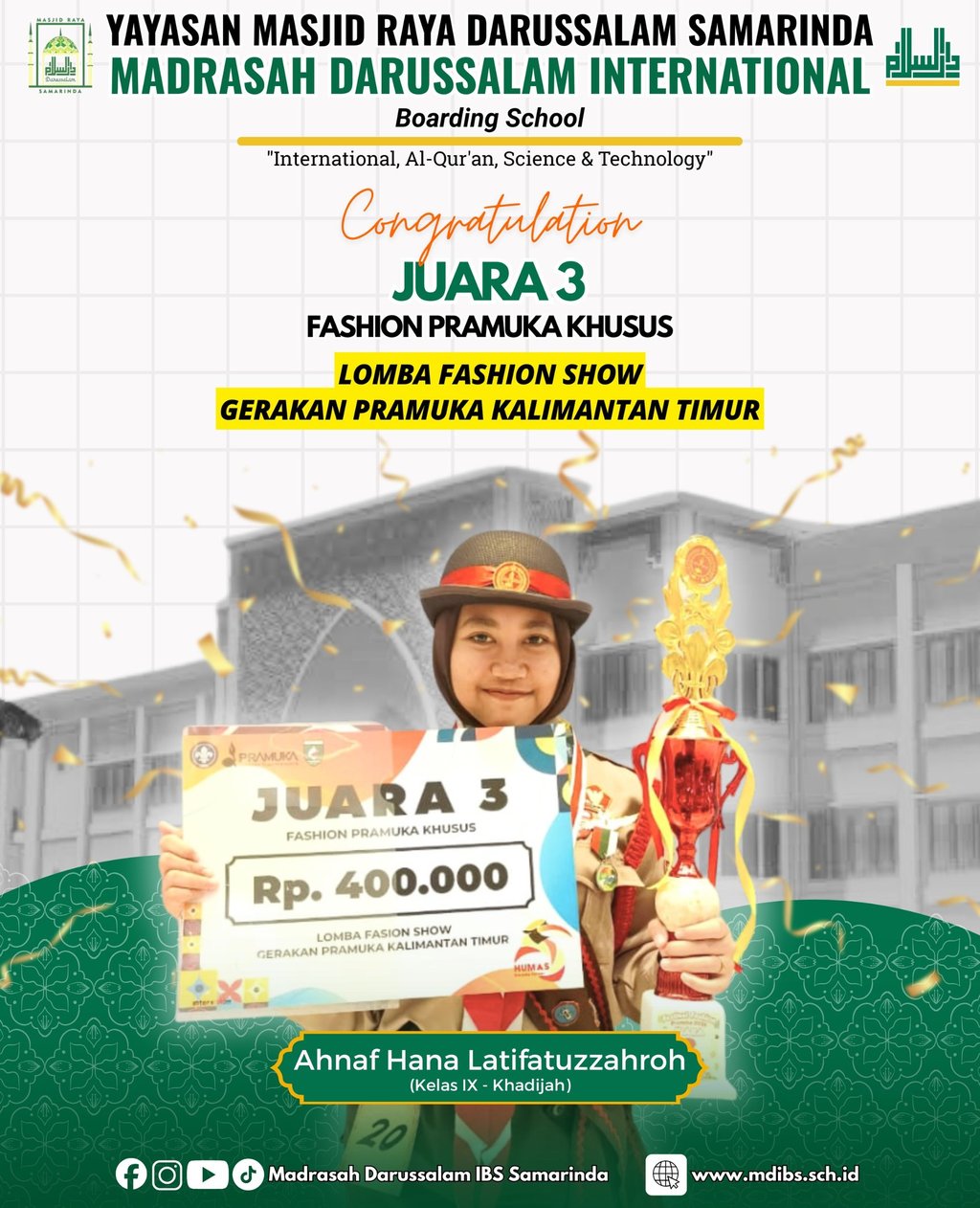 Ahnaf Hana Latifatuzzahroh, santriwati kelas IX-Khadijah Madrasah Darussalam IBS, berhasil meraih Juara 3 Fashion Pramuka Khusus Gerakan Pramuka Kalimantan Timur 2025.