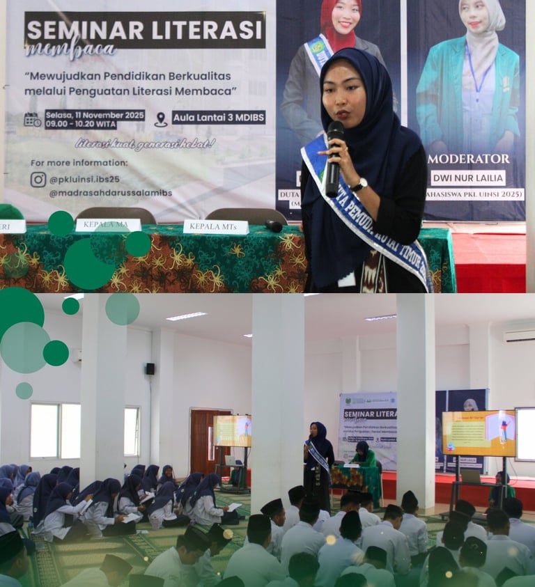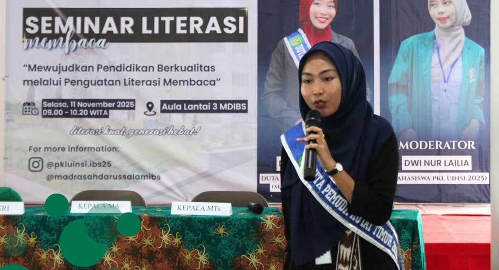 Seminar ini menghadirkan narasumber inspiratif, Dian Pramudita, Duta Pemuda Kutai Timur 2025, yang juaga merupakan salah satu mahasiswa PKL UNSI Samarinda membawakan materi seputar pentingnya literasi membaca sebagai dasar membentuk generasi pembelajar yang aktif, berpikir kritis, dan berdaya saing. Kegiatan dipandu oleh Dwi Nur Laila, mahasiswa PKL UINSI Samarinda 2025, yang juga berperan sebagai moderator.