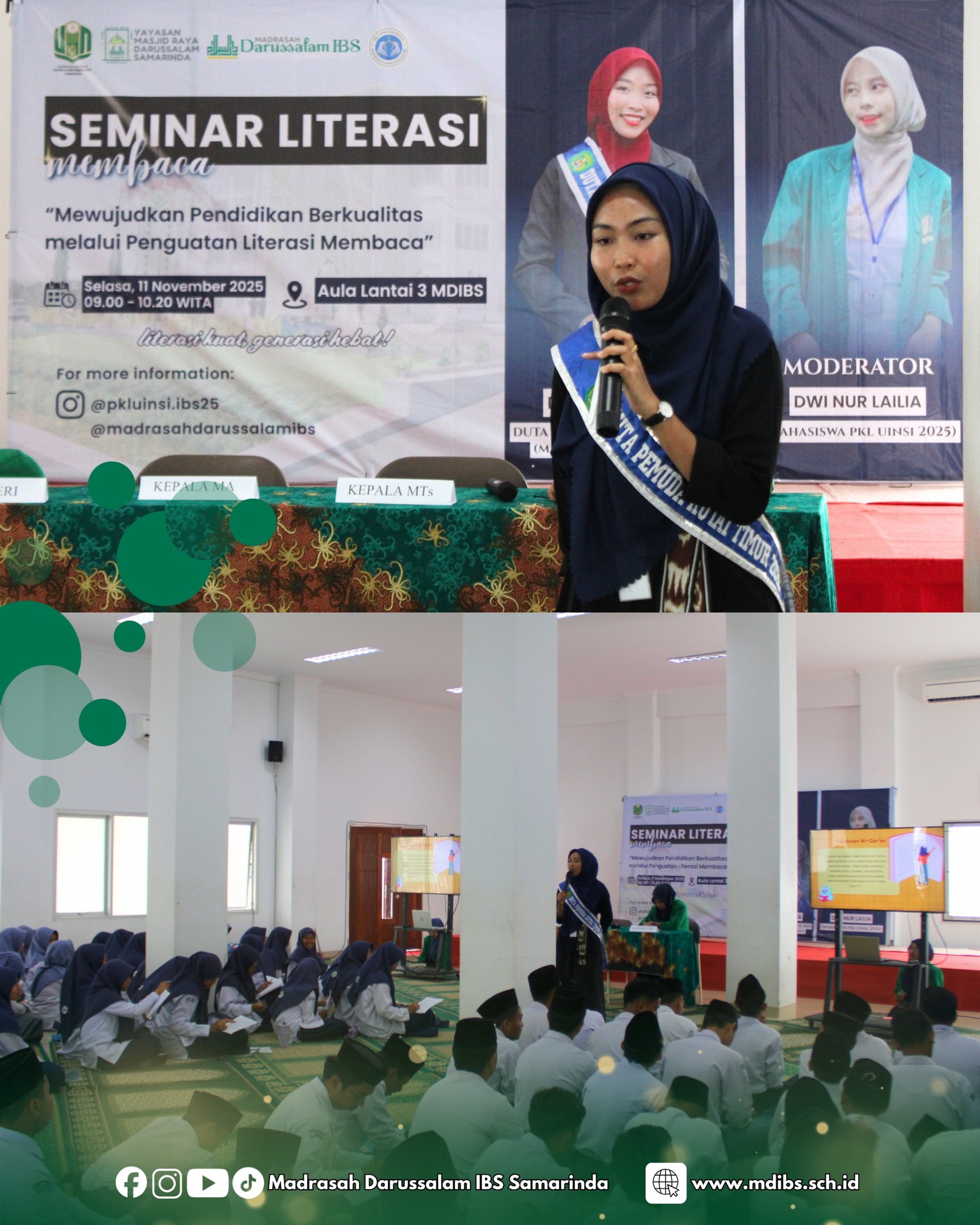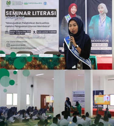 Madrasah Darussalam International Boarding School berkolaborasi dengan PKL UINSI Samarinda menggelar Seminar Literasi bertema “Mewujudkan Pendidikan Berkualitas melalui Penguatan Literasi Membaca” pada 11 November 2025 di Aula Lt.3 Madrasah Darussalam International Boarding School