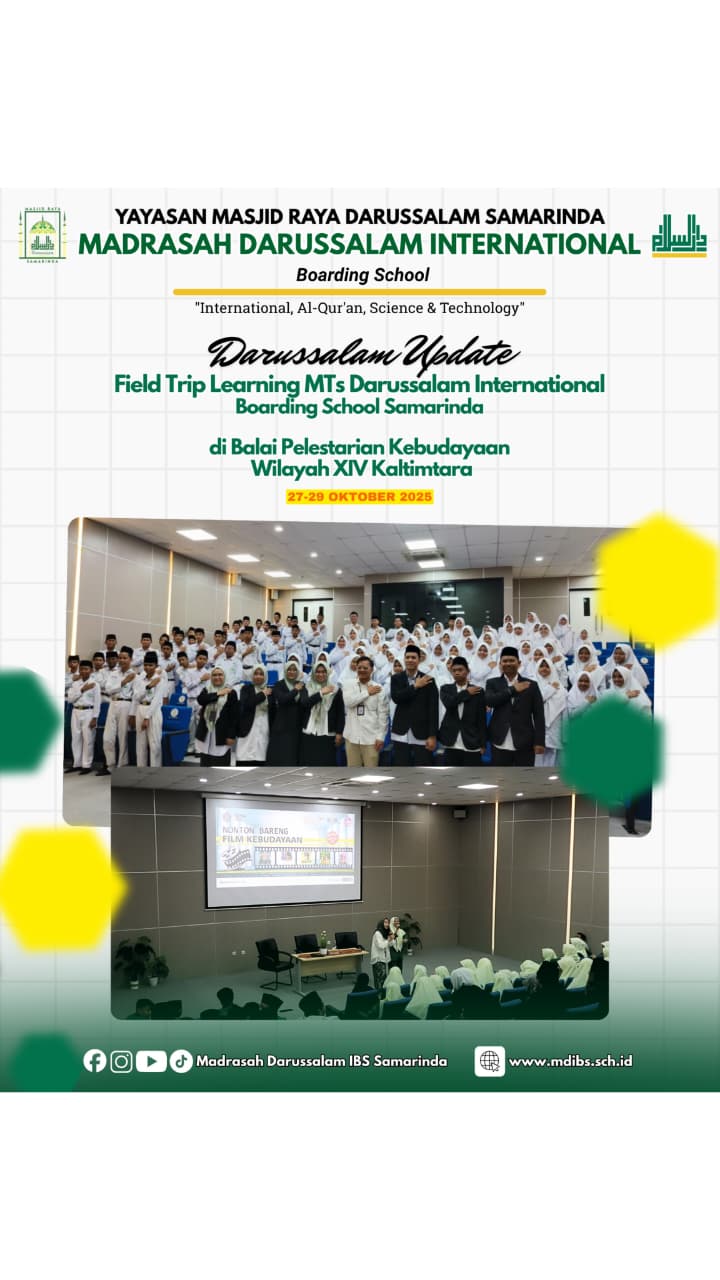 Siswa MTs Darussalam International Boarding School Samarinda mengikuti kegiatan Field Trip Learning ke Balai Pelestarian Kebudayaan XIV Kaltimtara pada 27–29 Oktober 2025. Belajar budaya, karakter, dan semangat kebangsaan dalam suasana seru dan edukatif.