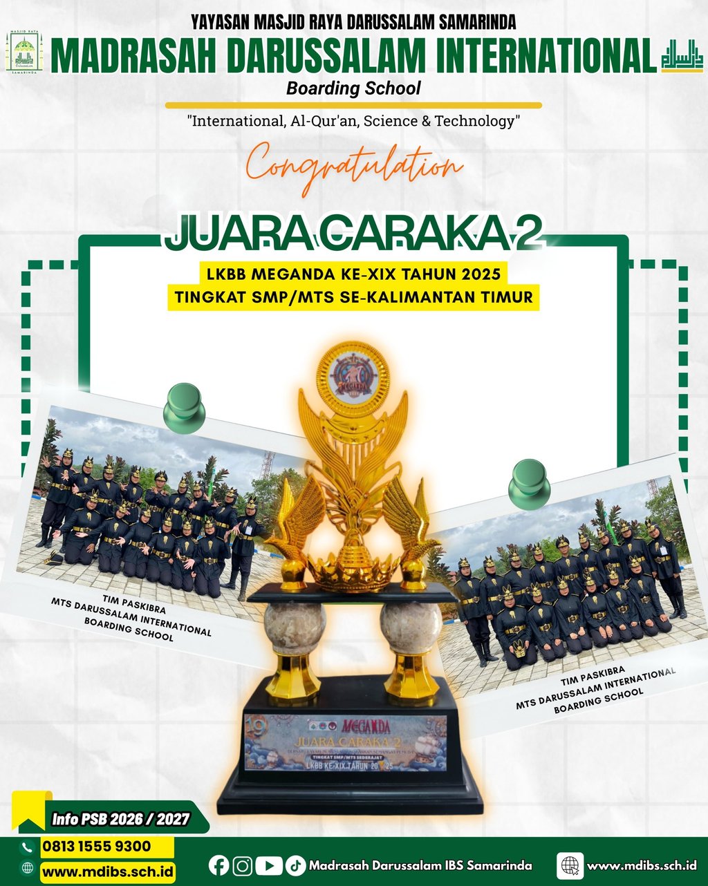 Tim Paskibra MTs Darussalam International Boarding School meraih Juara 2 pada LKBB MEGANDA 2025 Ke-XIX di Polnes Samarinda. Penampilan perdana yang penuh semangat dan mendapatkan apresiasi luas.
