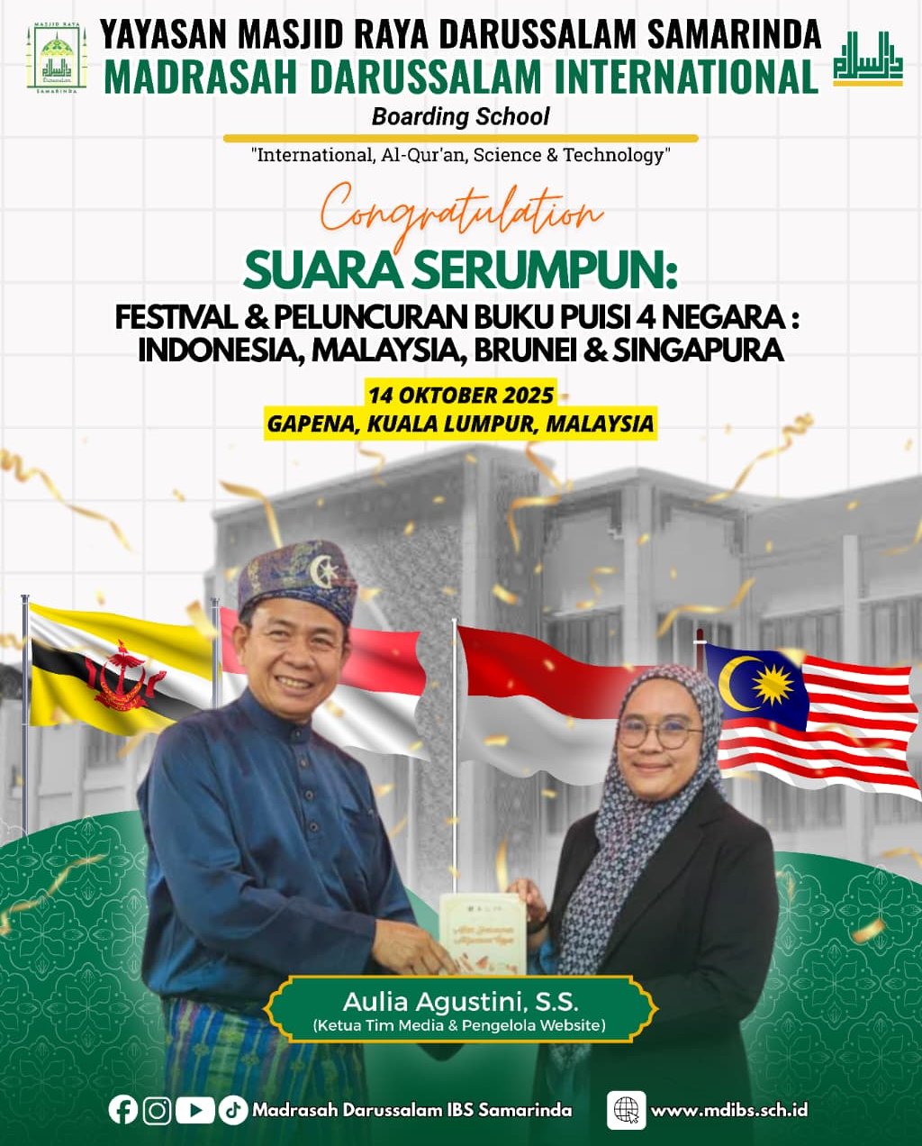 Mdibs.sch.id — Kabar membanggakan datang dari Madrasah Darussalam International Boarding School (IBS). Salah satu tenaga pendidiknya, Ustadzah Aulia Agustini, S.S., berhasil meluncurkan buku puisi lintas empat negara (Indonesia, Brunei Darussalam, Malaysia, dan Singapura) pada ajang Festival Suara Serumpun yang digelar di GAPENA, Kuala Lumpur, Malaysia.